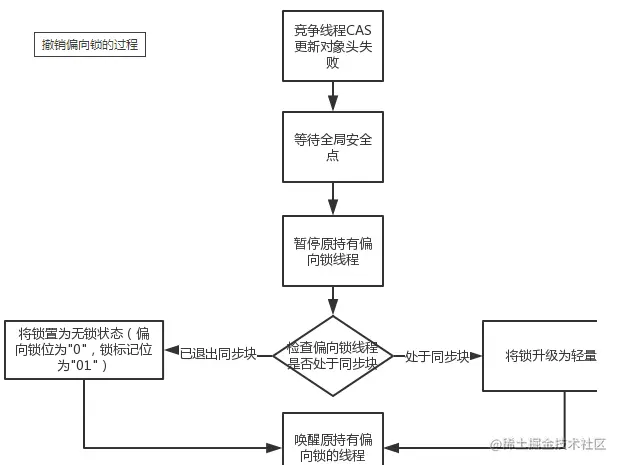 竞争线程尝试CAS更新对象头失败,会等待到全局安全点(此时不会执行任何代码)撤销偏向锁。