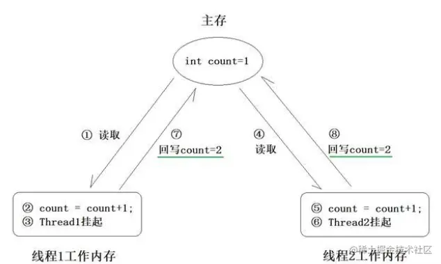 线程A、B同时对int count进行+1操作(初始值假设为1)在一定的概率下两次操作最终结果可能为2,而不是3。