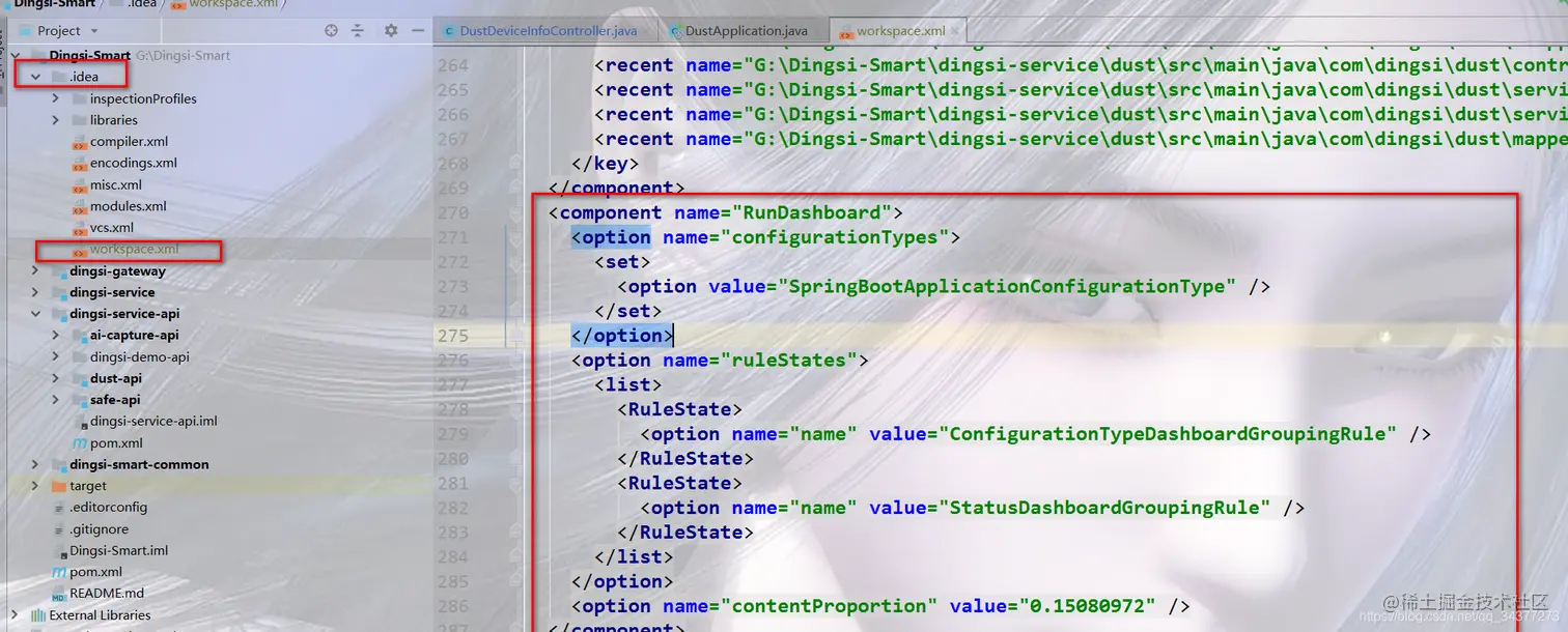 如果上述的选项里找不到Run Dashboard,可以在工程目录下找.idea文件夹下的workspace.xml,在其中增加如下组件: