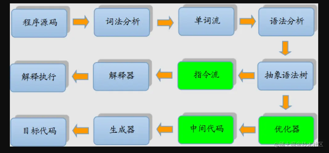 大部分的程序代码从开始编译到最终转化成物理机的目标代码或虚拟机能执行的指令集之前,都会按照如下图所示的各个步骤进行: