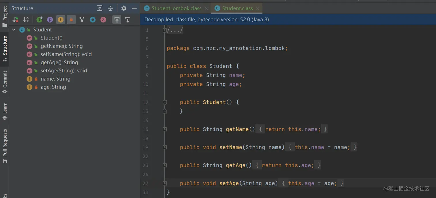 可以明显看出,使用了 @Setter、@Getter 注解后,和我们手动编写的 Java 代码,编译完的结果是一样的。