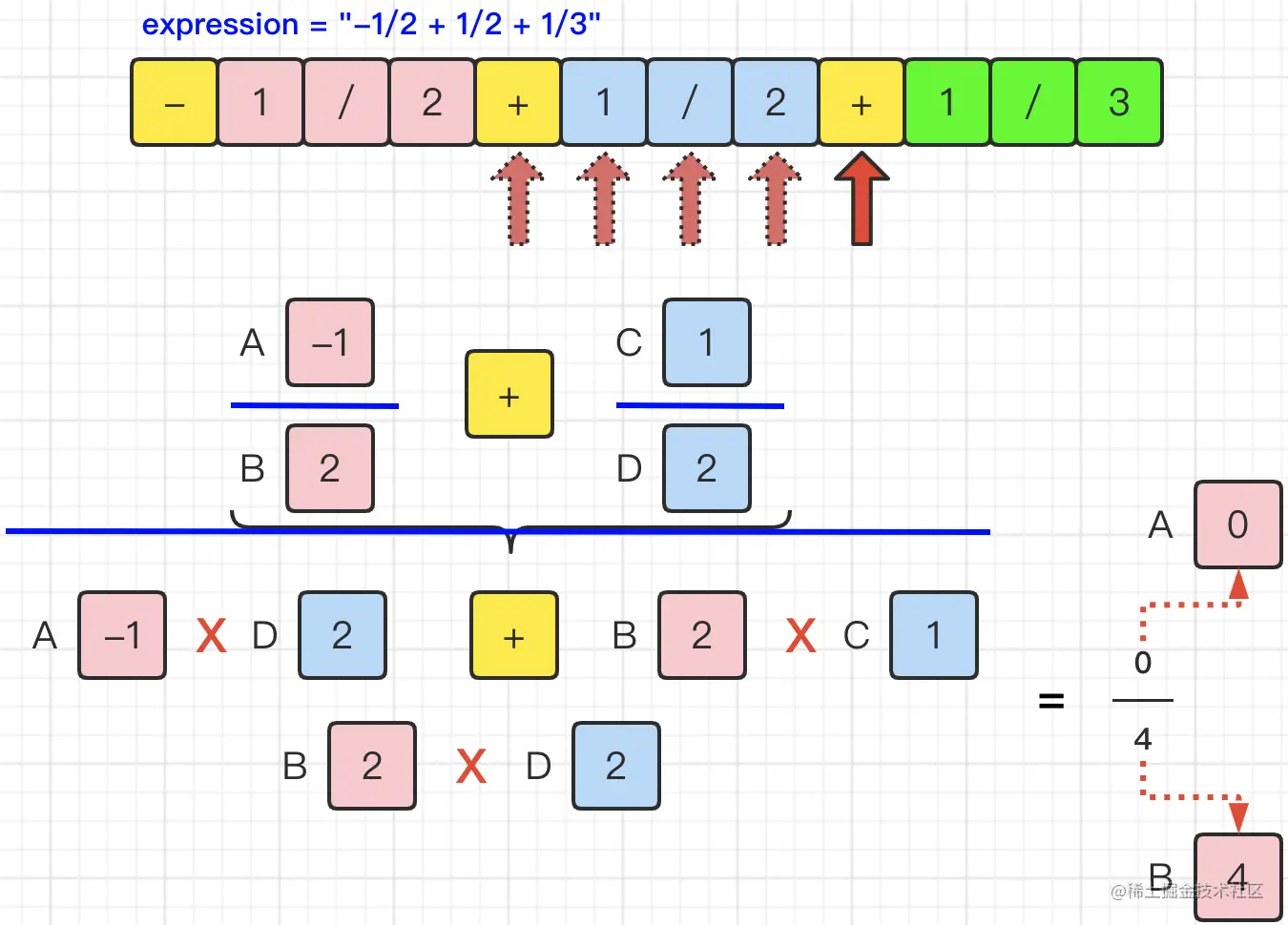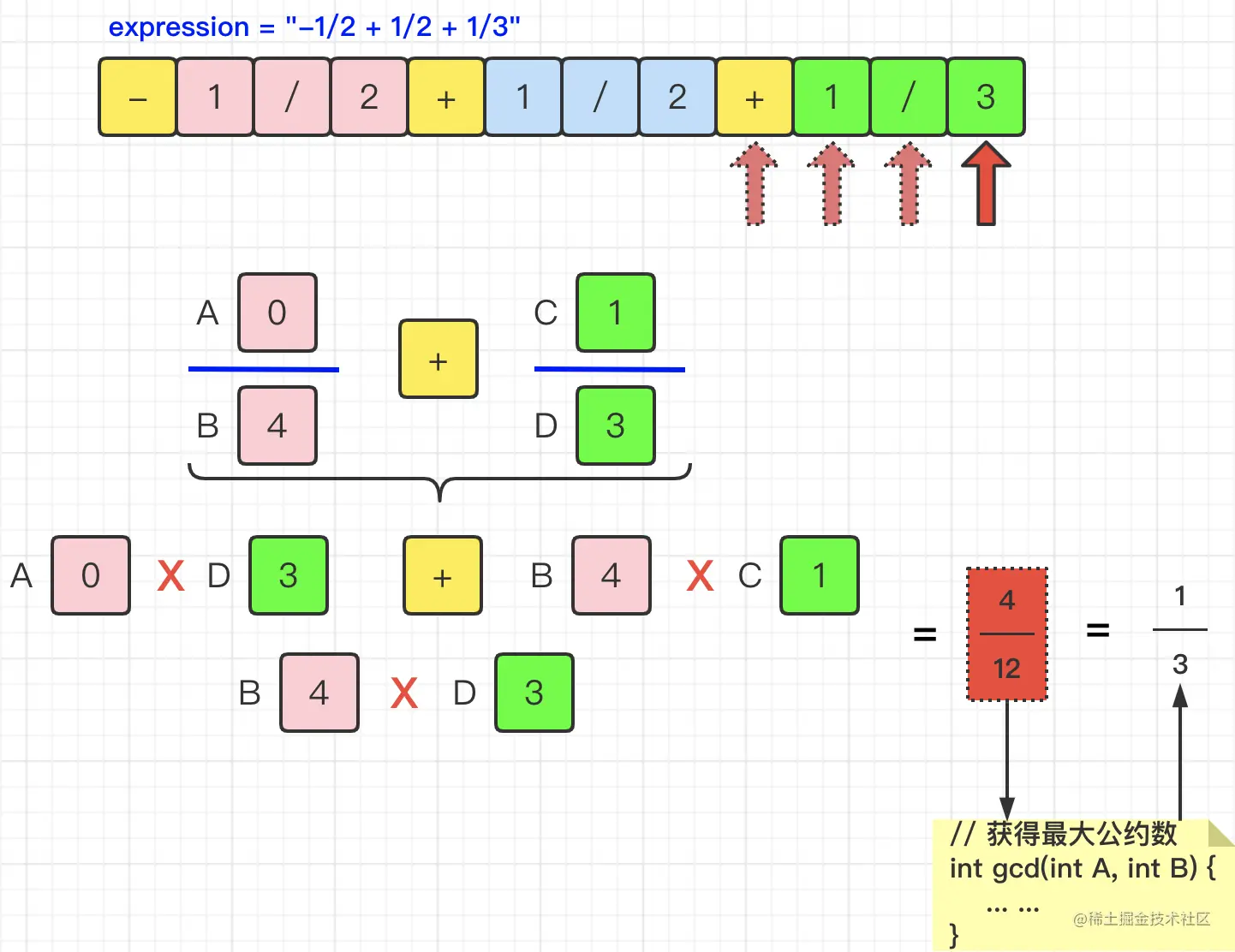 那么当循环到最后一个加号、减号的时候,大家要注意,在这个符号的后面,还“残留”着最后一个分数。当所有分数计算完毕后,我们将最终结果的分子和分母作为入参,调用gcd(int A, int B)方法,该方法的目的是寻求A和B这两个数的最大公约数。因为假设我们计算出的结果是4/12,我们需要循环4和12的最大公约数——即:4,然后通过分子和分母分别除以4,来获得最终的结果,即:1/3。如下是最后一轮符号判定的具体操作如下图所示: