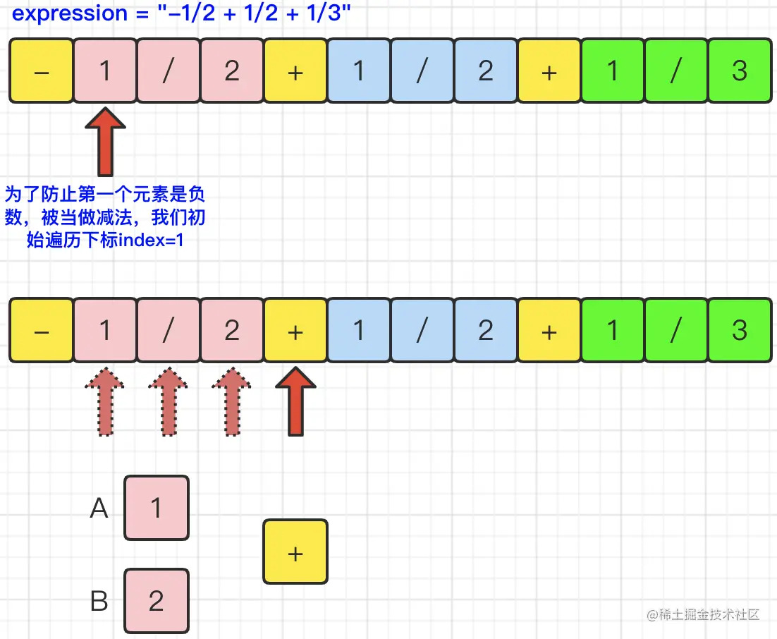 首先,通过题意,我们可以获得一个分数加减运算的字符串,由于计算公式中只有加法和减法,所以我们可以通过这两个符号对整个字符串进行字符串的拆分,将分数先拆分出来。如果是通过一种符号进行拆分,我们可以方便的使用split(...)方法进行字符串的拆分,但是由于本道题要根据加法或减法进行拆分,那么我们就需要采用indexOf(...)方法来确定加法或减法符号的具体位置,再根据返回值最小(即:哪一个在前面)来确定执行加法还是减法操作。在这里还有一个细节,就是如果第一个分数是负数的话,我们会将其负号判断为减号,所以,为了避免这种情况发生,我们从index=1的位置开始判断。即:调用indexOf("+", 1)和indexOf("-", 1)这两种方法。第一次符号判定的具体操作如下图所示: