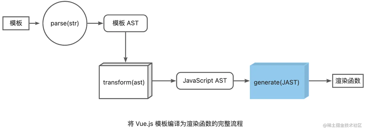 代码生成器 generate 在编译器的编译过程中负责将 JavaScript AST 转换成渲染函数,如下图所示: