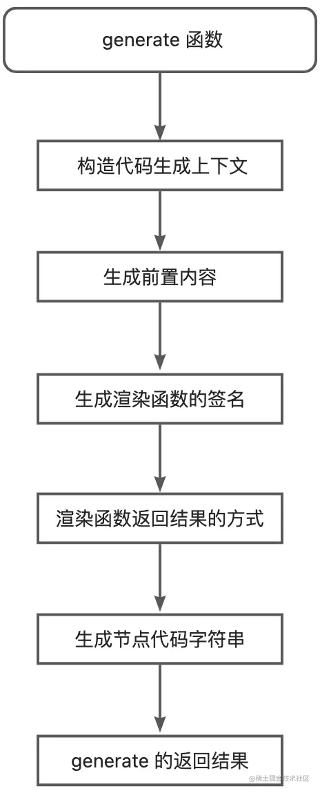 接下来介绍了生成器的执行流程,首先是构建代码生成上下文,接下来是生成前置内容、生成渲染函数的签名、到返回结果的方式、再到生成节点代码字符串,到最后生成器的返回结果。