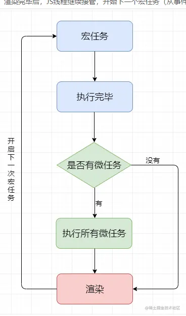 js分为主线程、调用栈和任务队列,主线程调用执行栈,先执行同步任务,再执行异步任务,等待异步回调结果,这些回调在任务队列里面等待主线程空闲时调用,先执行微任务回调,再执行下面的宏任务回调,微任务比较常见的就是Promise和MutationObserver(监听DOM变化),宏任务就是js执行代码,setTimeout,setInterval等等,dom渲染不在事件循环中,事件循环只有js