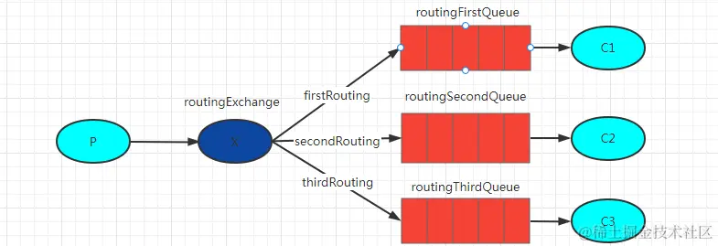 firstRouting路由键,找到对应的绑定队列routingFirstQueue,就被routingFirstQueue队列消费了。