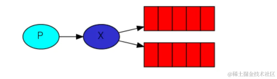 X表示交换机,使用的扇形交换机(fanout),它将发送的消息发送到所有绑定交换机的队列。