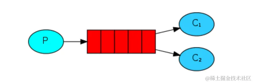 多个消费者,也就是一对多的关系。 - 在多个消费者之间分配消息(竞争消费者模式),类似轮询发送消息,每个消息都只发给一个消费者。
