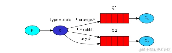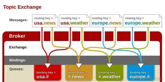 主题模式是将路由键根据一个主题进行分类,和直连模式不同的是,直连模式绑定特定的路由键,而主题模式使用通配符绑定路由键,绑定键有两种: