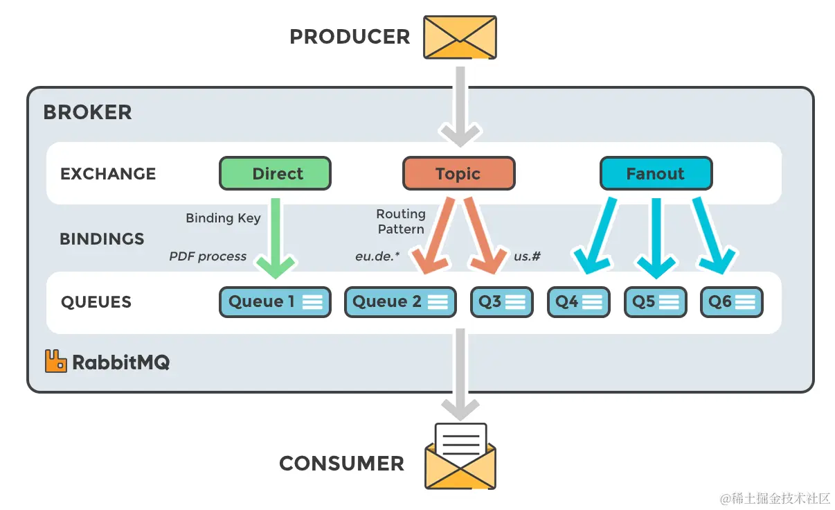 消息从生产端发送到消费端,一定要通过队列转发,使用queue_name表示: