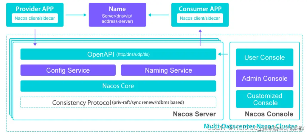 Nacos的整体架构还是比较清晰的,我们可以从下面这个官方提供的架构图进行简单分析。