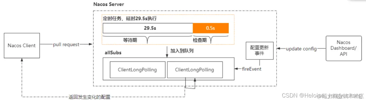 Nacos 客户端会循环请求服务端变更的数据,并且超时时间设置为30s,当配置发生变化时,请求的响应会立即返回,否则会一直等到 29.5s+ 之后再返回响应