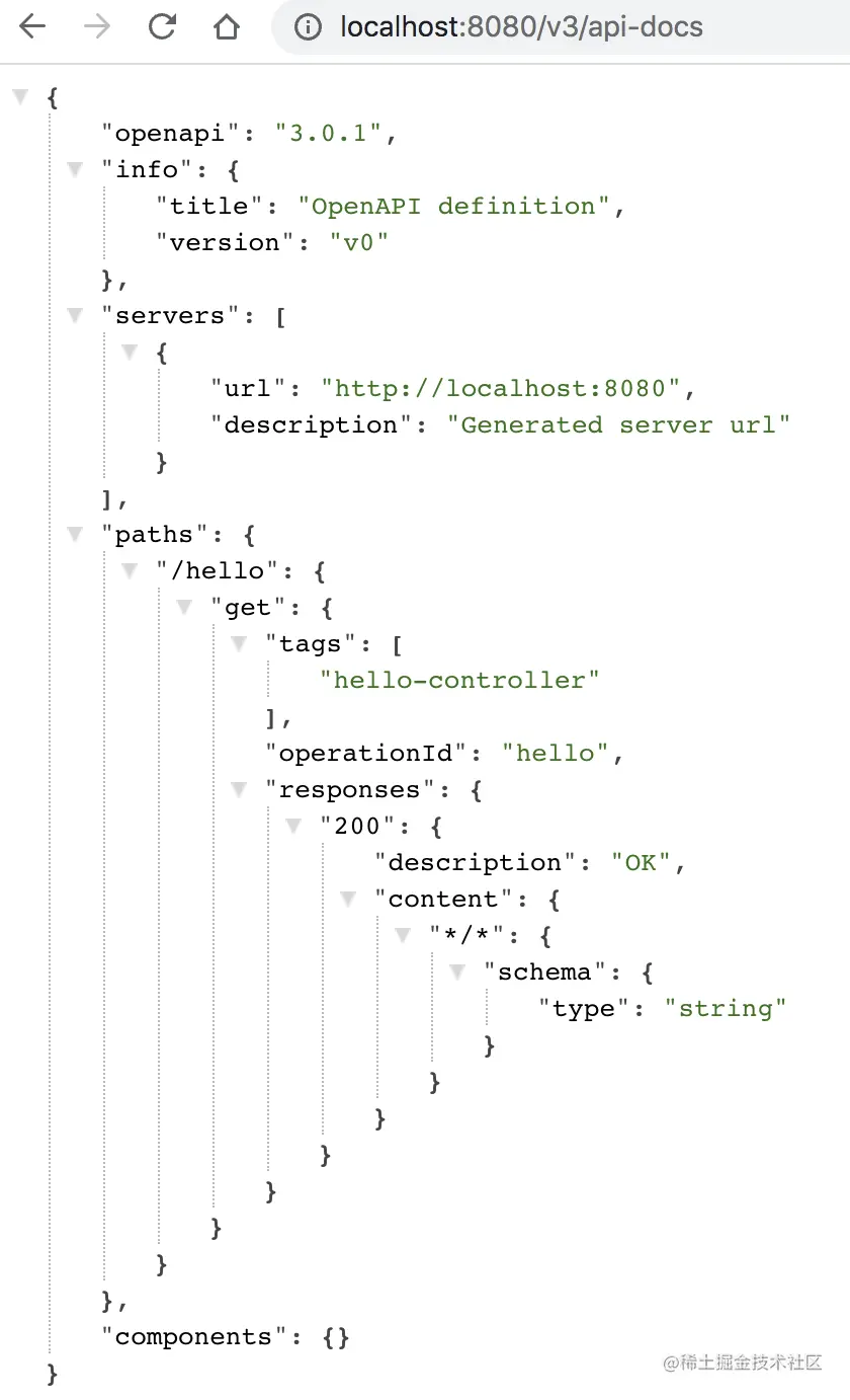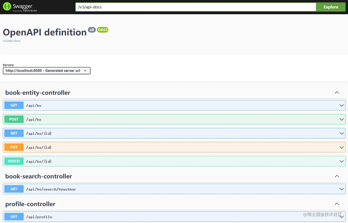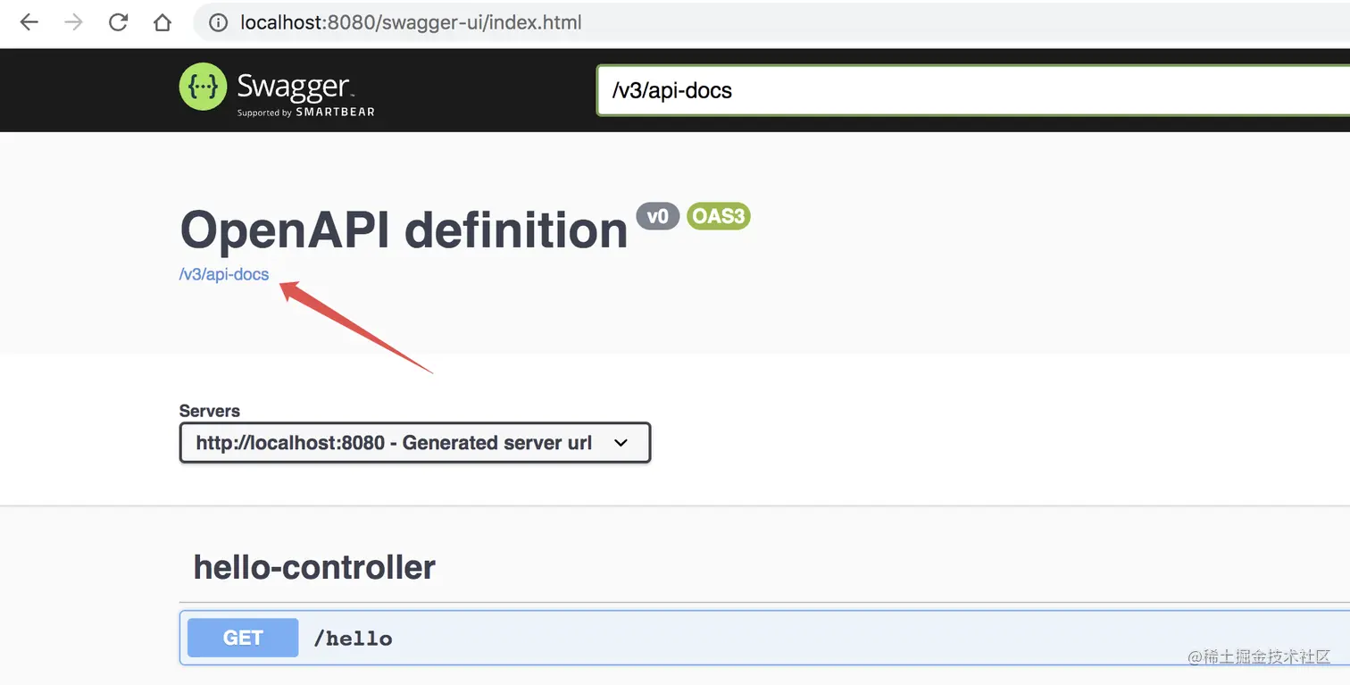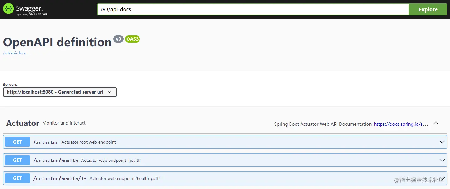 这个网页上有一个输入框,输入的内容是 /v3/api-docs,这个地址就是这个网页想要渲染的 JSON 的地址,如果开发者修改了生成的 JSON API 文档的地址,那么就需要手动在这个输入框中输入一下 JSON API 文档的地址。