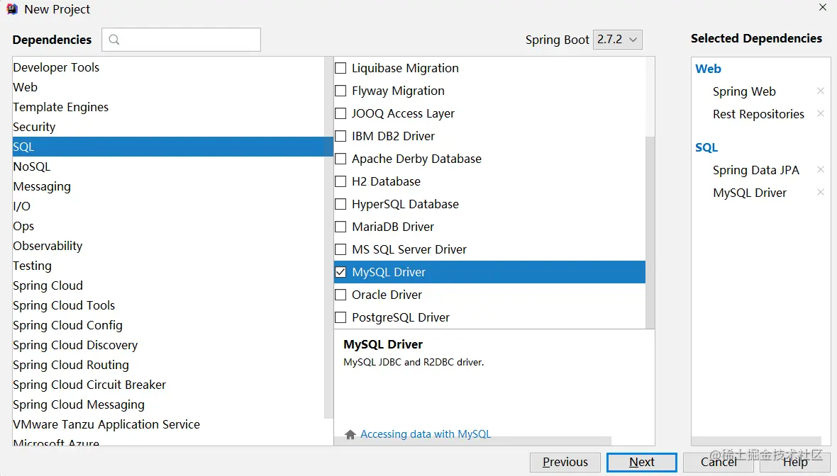 首先创建一个 Spring Boot 工程,引入 Web 、 Jpa 、 MySQL 、Rest Repositories 依赖: