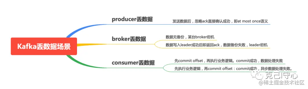发送数据后,忽略ack直接确认成功:即kafka的at most once语义。生产者认为数据生产成功,但是broker数据处理失败。造成数据丢失 consumer在消费数据和commit offset时会遇到下面的场景: