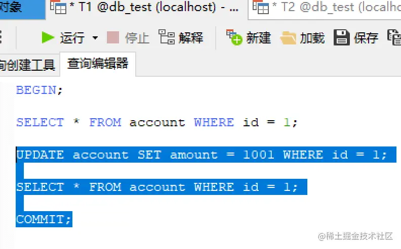 最后,在事务T1中修改id=1记录,将amount修改为1001,然后再进行一次查询