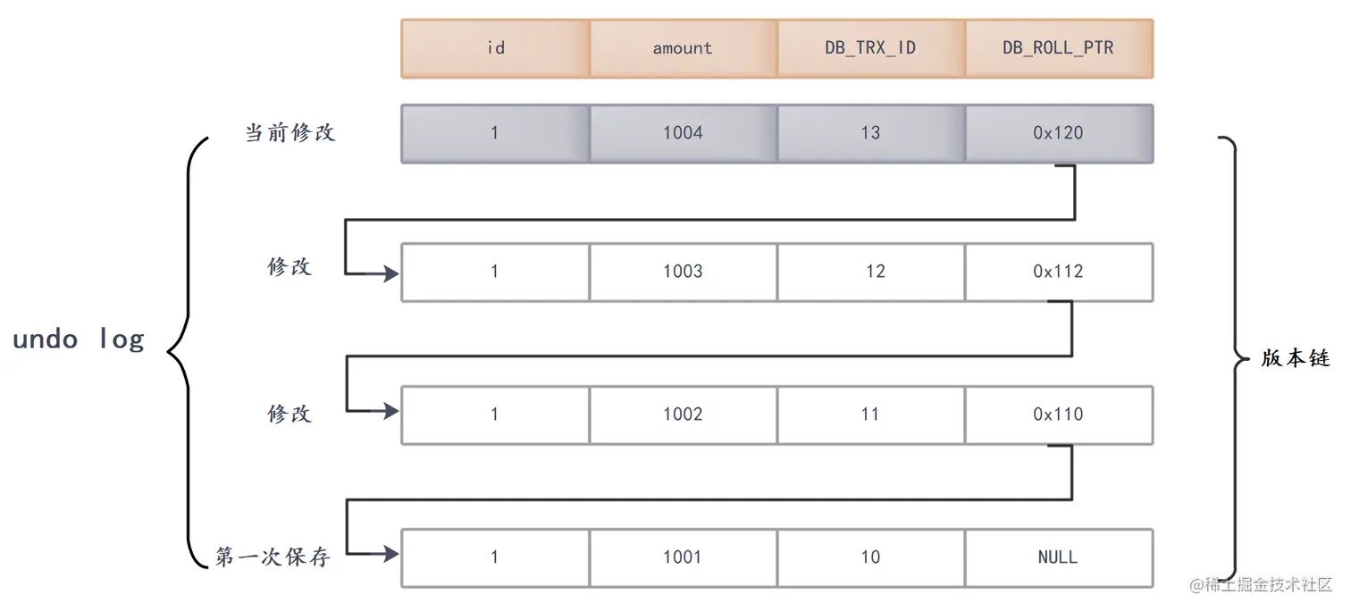 可以把DB_ROLL_PTR以外的数据看成链表的数据部分,DB_TRX_ID字段是当前数据的版本,DB_ROLL_PTR看成链表的指针部分,第一条数据相当于是链表的头部,这些版本串联成一个链表,所以DB_TRX_ID和DB_TRX_ID就组成了undo log的版本链。