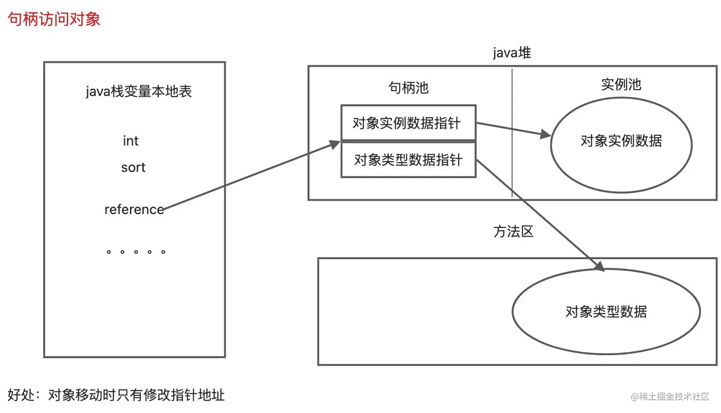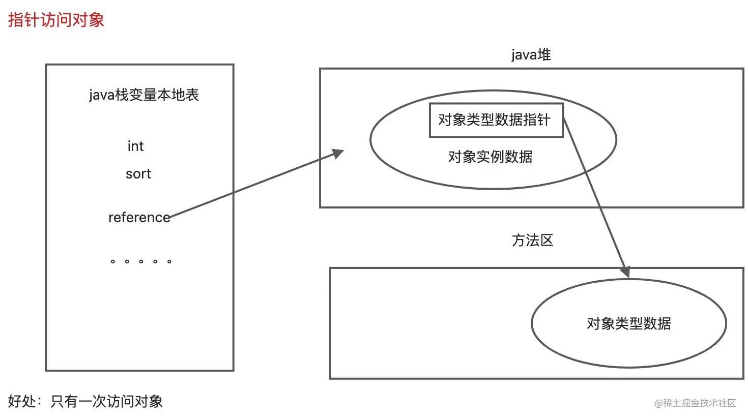 - 指针访问,java堆中存放访问类型数据,reference中存储的直接就是对象地址,好处:只用访问一次