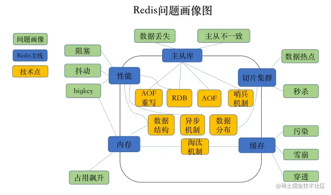 这里,分享给你一张 Redis 问题画像图,帮你快速查找问题对应的 Redis 主线模块,进而定位相应的技术点。