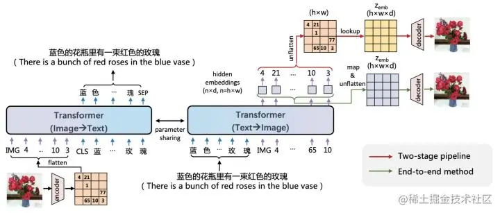 ERNIE-ViLG模型考虑进一步考虑了Transformer模型学习知识的可迁移性,同时学习了从文本生成图像和从图像生成文本这两种任务。其架构图如下所示: