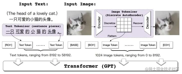 图像矢量量化是指将图像进行离散化编码,如将256×256的RGB图像进行16倍降采样,得到16×16的离散化序列,序列中的每个image token对应于codebook中的表示。常见的图像矢量量化方法包括:VQVAE、VQVAE-2和VQGAN等。我们采用VQGAN在ImageNet上训练的f16_16384(16倍降采样,词表大小为16384)的模型权重来生成图像的离散化序列。