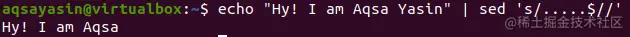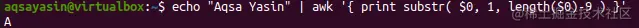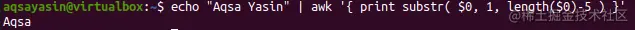Awk是一种复杂的脚本语言,可用于匹配模式和处理文本。你可以使用Awk以各种不同的方式来转移和修改输入。你也可以使用awk从字符串中删除字母。Awk似乎与 "sed "有些不同。这次我们用 "Aqsa Yasin "来改变字符串。awk函数将通过substr方法做子串并在终端打印。函数length被用来显示从所述字符串中删除的字母数量。这里,"length($0)-5 "意味着删除字符串的最后5个字符,剩下的将成为子串的一部分被打印出来。