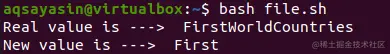 当我们执行更新后的bash文件时,输出结果与预期一致。它显示了第一个变量的原始字符串和第二个变量 "new "的值,后者是由变量 "val "创建的。