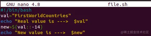 将下面的代码复制到其中。这段代码在开始时包含了bash扩展名,之后,我们声明了一个字符串变量 "val",其值为一个字符串。在另一行,我们使用 "echo "短语来在终端显示这个变量。真正的任务从这里开始。我们初始化了一个变量 "new",并给它分配了一个值,这个值是原始变量 "val "的一个子串。我们通过在双冒号后的大括号中提到"-14 "来做到这一点。这告诉编译器,它必须从原始字符串 "FirstWorldCountries "中删除最后14个字母。剩下的字母将被保存到变量 "new "中。在最后一行,"echo "已经被用来打印新的变量 "new"。