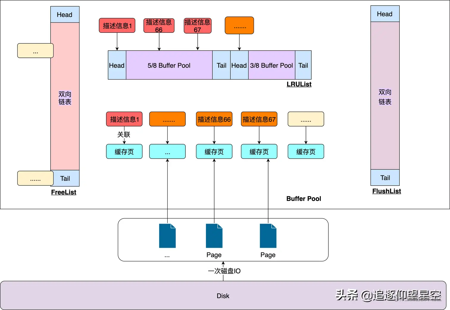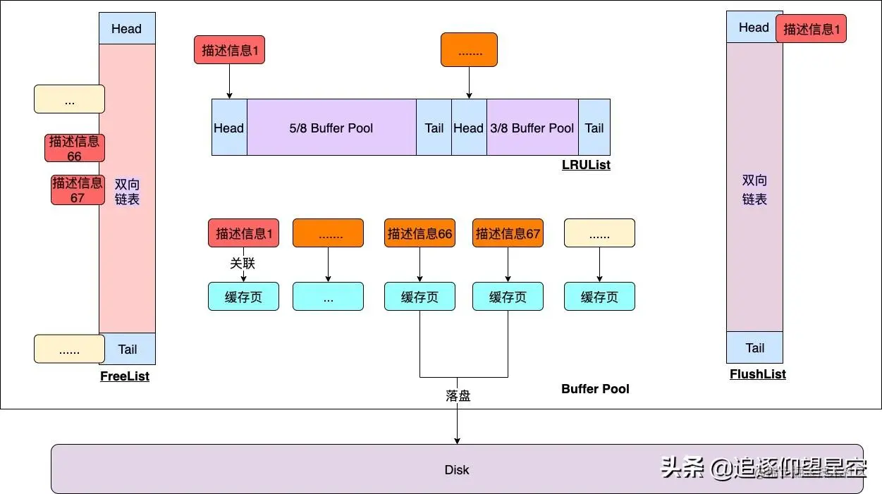 描述信息66、67指向的缓存页被刷新进磁盘。 同时从FlushList中将其移除,然后存入FreeList中。完成一个循环