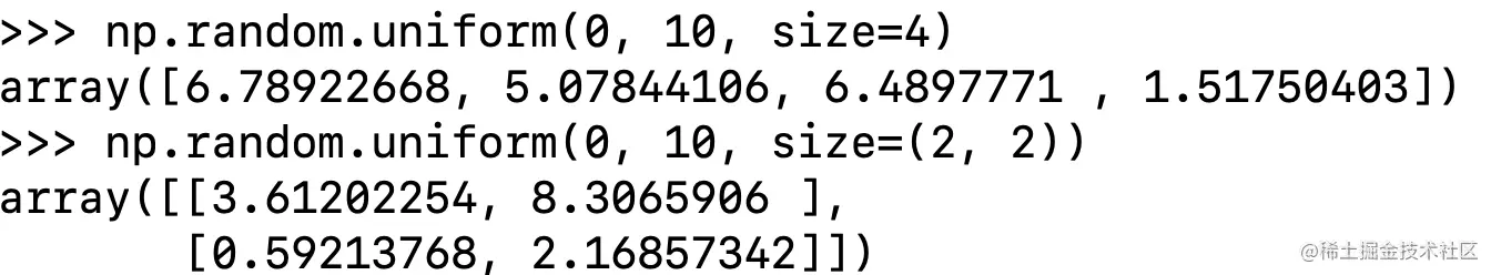 上面的代码生成了一个在0和1之间采样的均匀随机数。我们可以用参数low和high来指定区间的下边界和区间的上边界。参数low指定了区间的下边界,默认情况下,它的值为0。参数high指定了区间的上边界,默认情况下,它的值为1。