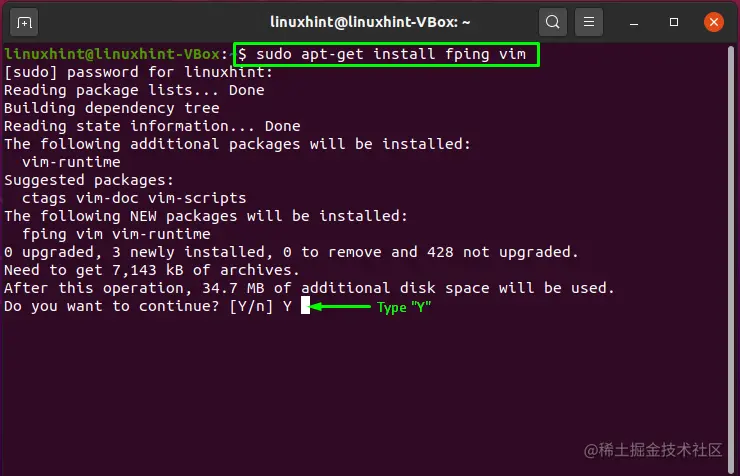 在下面的例子中,我们将尝试用一条命令来安装两个软件包,"fping "和 "vim"。