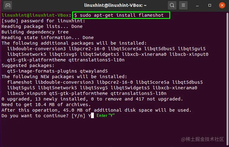 例如,我们将在Ubuntu中安装 "flameshot"包,这是一个供Ubuntu用户免费使用的注释工具。这个包有各种各样的标记工具。 为了在我们的系统中安装它,我们将写出这个命令。