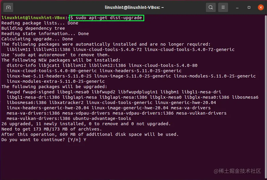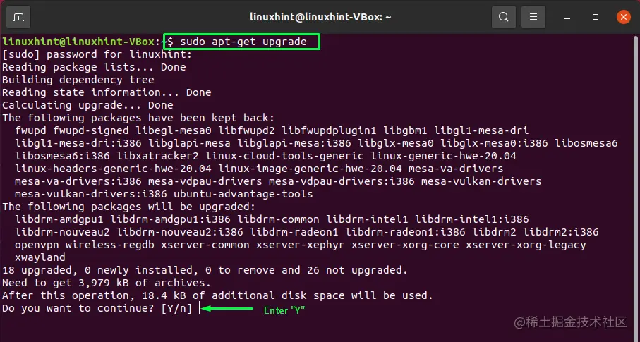 如果你想升级软件包,那么在Ubuntu终端写出下面的命令。