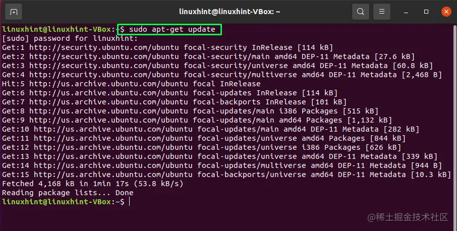 apt-get通过一个已知和可访问的软件应用程序数据库工作。它使用这个数据库来执行安装、搜索软件包和其他各种任务。因此,在我们开始任何apt-get打包活动之前,我们必须首先检查我们本地的数据库副本是否已经更新。利用下面给出的命令来更新软件库。对于大多数活动,apt-get需要管理员权限。