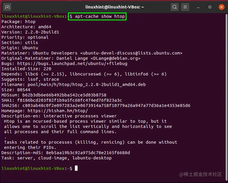 举个例子,在Ubuntu终端执行这个命令来查看 "htop"软件包的信息。