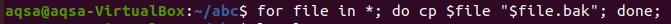 $ for file in *; do cp $file “$file.bak”; done;