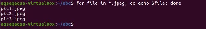 $ for file in *.jpeg; do echo $file; done