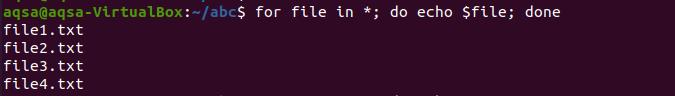 "*"用于表示这个目录中存在的所有文件。这使得 "for "循环可以抓取所有的文件。但为了使输出精确,你可以添加一些带星号的术语。例如,'file-*'用于从文件开始的所有文件。而*.txt则用来获取以.txt为扩展名的文件。我们将在文章中进一步使用这些例子。