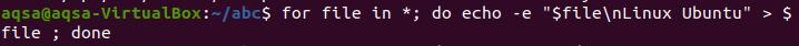 $ for file in *; do echo -2 “$file\nLinux Ubuntu” > $file ; done