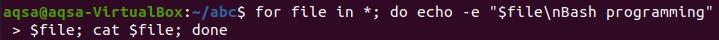 $ for file in *; do echo –e “$file\nbash programming” > $file; cat $file; done