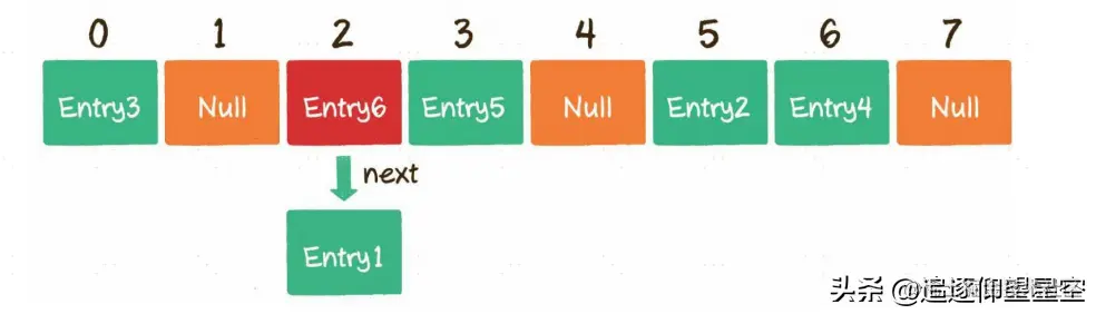 由于数组的长度是有限的,当插入的Entry越来越多时,不同的Key通过哈希函数获得的下标有可能是相同的。这种情况,就叫作哈希冲突。
