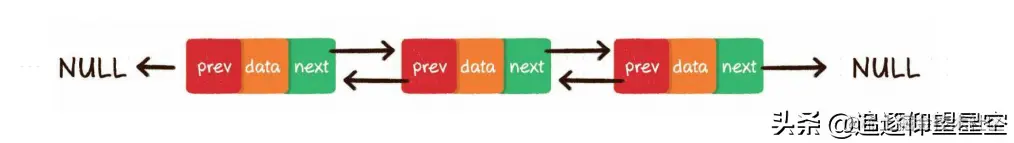 双向链表比单向链表稍微复杂一些,它的每一个节点除了拥有data和next指针,还拥有指向前置节点的prev指针。