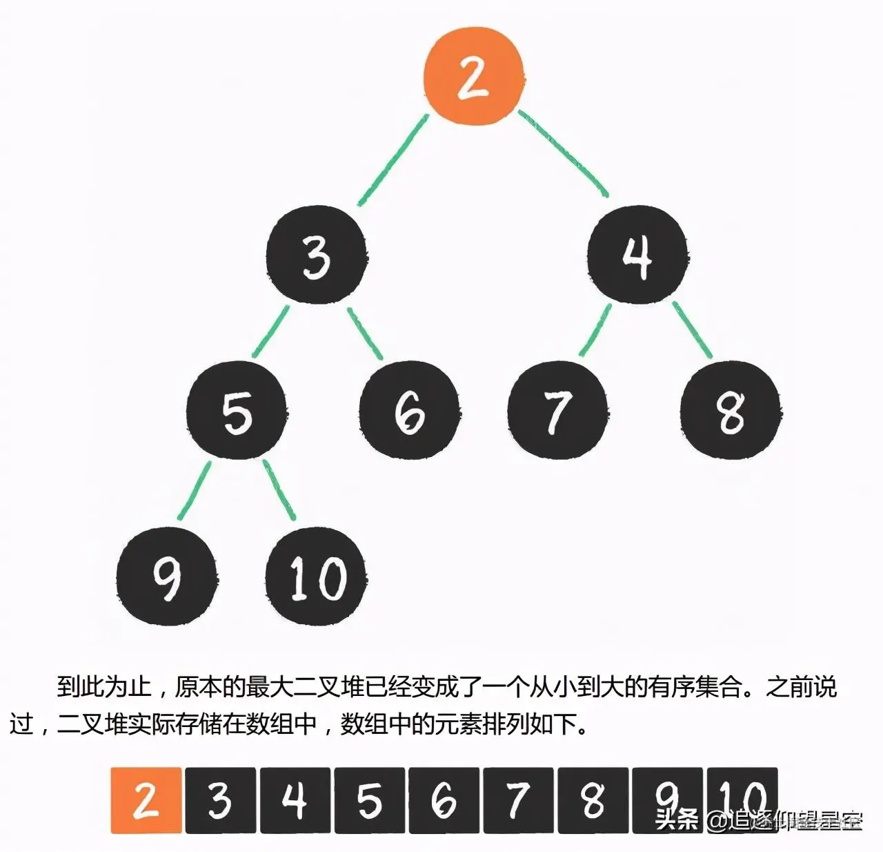 - 循环删除堆顶元素,并将该元素移到集合尾部,调整堆产生新的堆顶。