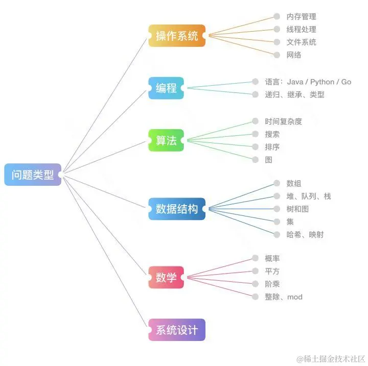 这里有一张互联网公司面试中经常考察的问题类型总结的思维导图,我们可以结合图片中的信息分析一下。
