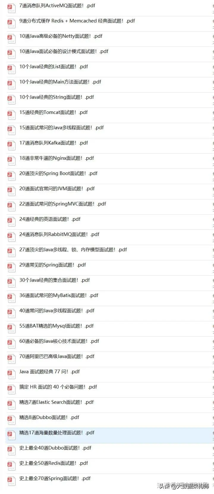 包含的内容比较多,也比较全,主要包括:消息队列ActiveMQ、分布式缓存 Redis + Memcached、Java高级必备的Netty、Java面试必备的设计模式、Java经典的List、Java经典的Main、Java多线程、消息队列Kafka、非常牛逼的Nginx、顶尖的Spring Boot、JVM面试题、高级Java面试题、史上最全Redis面试题、Elastic Search、Mysql等等面试题!