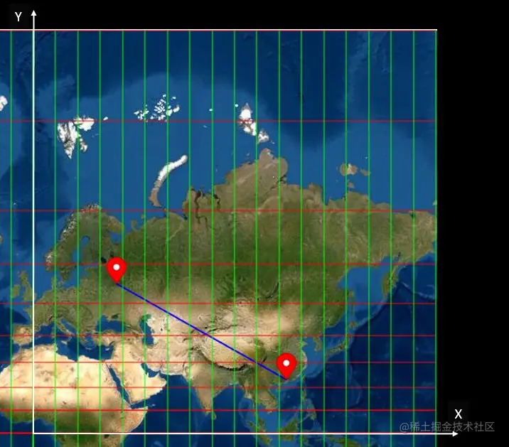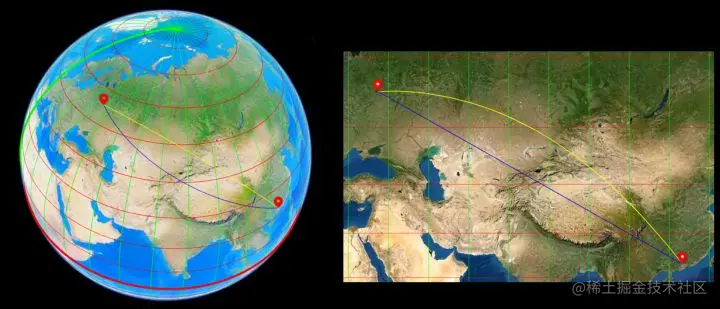那我们在墨卡托投影的平面上连接投影后两点得到的直线(如下图蓝线)又是什么呢?