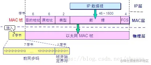 c)插入的8字节:由硬件生成。由两个字段构成,第一个字段是7个字节的前同步码(1和0交替出现)作用是使接收端的适配器在接收MAC帧时能迅速调整时钟频率,使它和发送端的时钟同步(实现位同步)。第二个字段是帧开始定界符,前六位作用和前同步码一样,最后连续的1告诉接收端适配器MAC帧马上要来了。