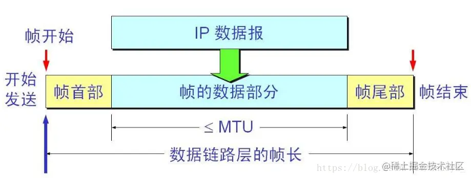 封装成帧:帧是数据链路层的传送单位。一个帧的帧长等于帧的数据部分加上帧的首部和尾部的长度。首部和尾部的一个重要作用是帧定界(确定帧的界限)。每一种链路层协议都规定了所能传输的帧的数据部分的上限既最大传输单元MTU。(见下图,图片来自百度)