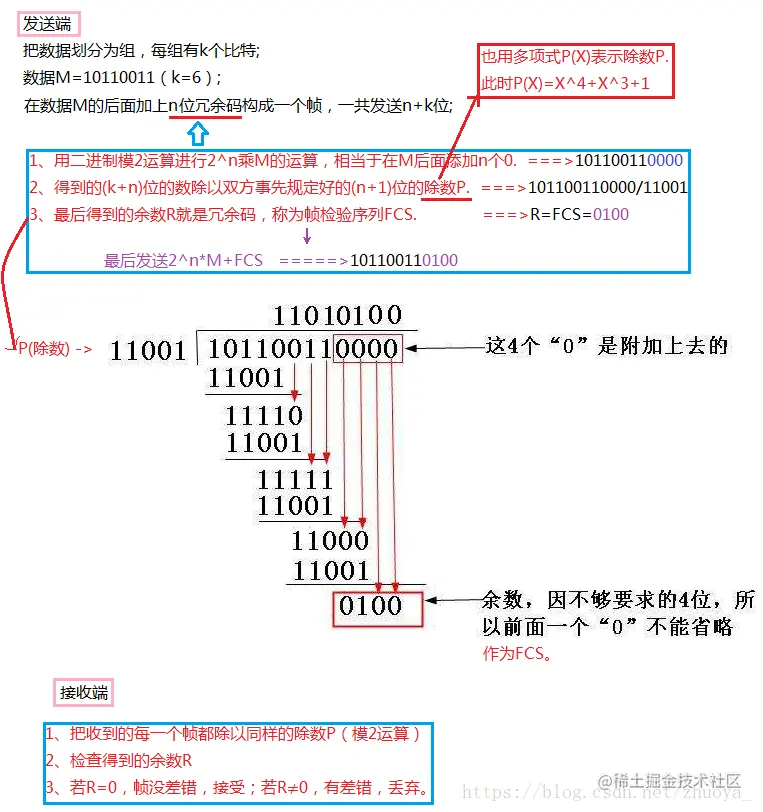 差错检验:实现无比特差错。传输错误的比特占传输比特总数的比特率称为误码率BER(Bit Error Rate)。数据链路层采用循环冗余检验CRC的检错技术。过程如下: